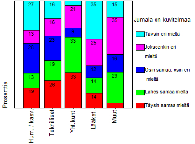 Tieteenalojen erot ovat monissa kysymyksissä myös ilmiselvät. Vaikkakin tiettyjen tiedekuntien osalta vastausmäärät jäivät sen verran vähäisiksi, ettei tilastollisesti luotettavia tuloksia kaikilta osin saatu, epäselväksi ei jää, että teknisiä tieteitä, matematiikkaa ja luonnontieteitä edustavat opettajat ovat varsin vahvasti naturalistis-materialistisesti orientoituneita. Väitteeseen, ettei monoteististen uskontojen Jumalaa ole olemassa, yhtyy (lähes tai täysin samaa mieltä) yhteiskuntatieteilijöistä 66 %, teknillisten tieteiden edustajista 45 % (mukana matemaatikot ja luonnontieteilijät), humanisteista / kasvatustieteilijöistä 32 %, lääketieteilijöistä 28 % (mukana hoitotiede) ja ryhmän ”muut tieteenalat” edustajista 33 %.