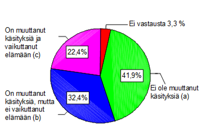 Oheinen kuvio 3 osoittaa, että yli 40 % vastanneista on sitä mieltä, ettei tieteen harjoittaminen ole juuri muuttanut heidän käsityksiään. Vain reilu viidesosa yliopisto-opettajista kokee tieteeseen perehtymisen sen luonteiseksi, että voi kuvata sen muuttaneen omaa maailmankuvaa ja -katsomusta siinä määrin, että sillä on ollut vaikutusta myös jokapäiväiseen elämään.