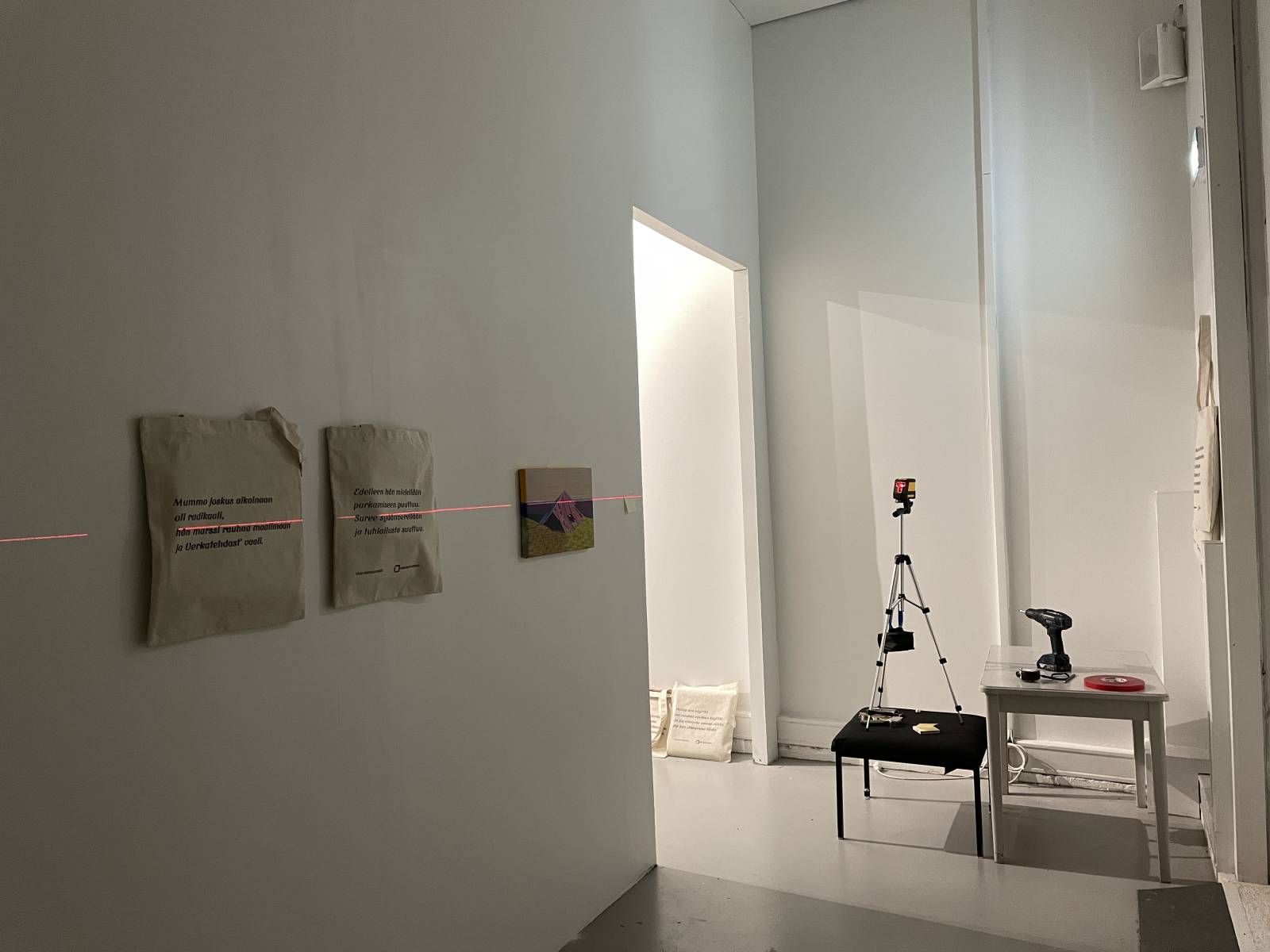 Teosta suunnitellessamme totesimme, että taidenäyttelyn kontekstissa tekstiin painottuvilla teoksilla on riski tulla otaksutuiksi visuaalisempien teosten seliteteksteiksi. Pohdimme tätä etenkin, kun tiesimme tekstiemme asettuvan taidemaalari Elina Förstin värikylläisten maalausten rinnalle.