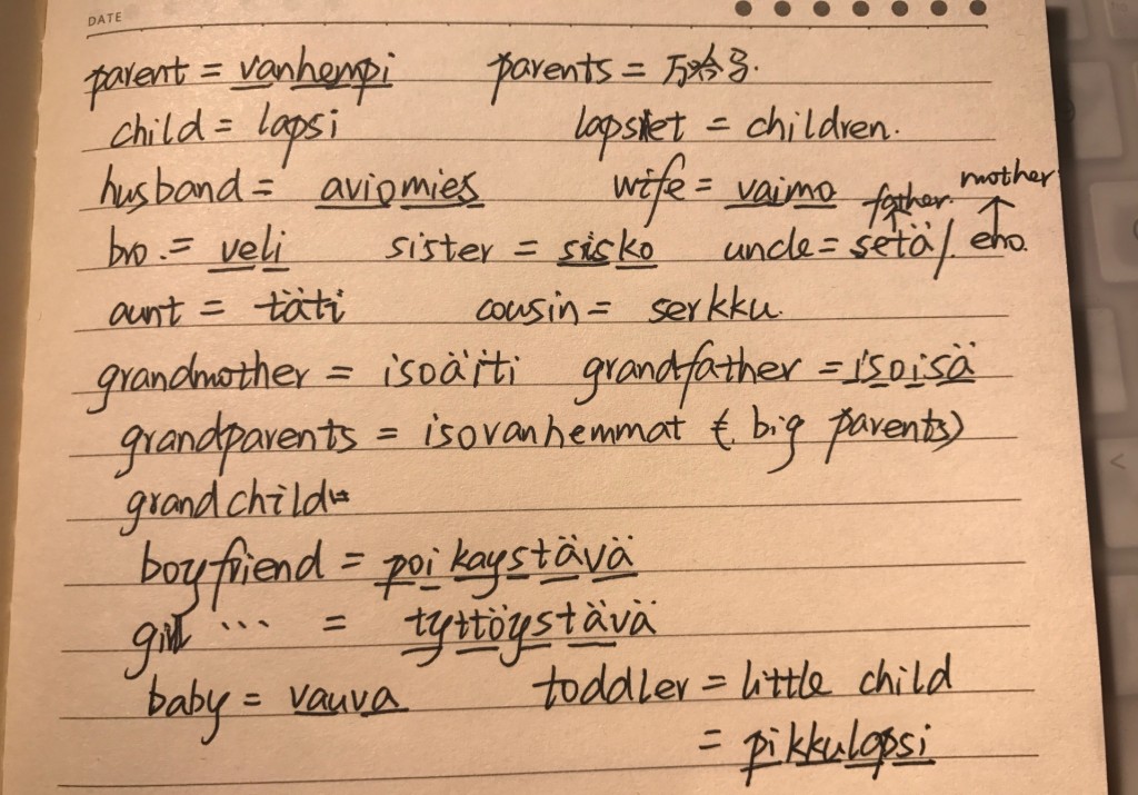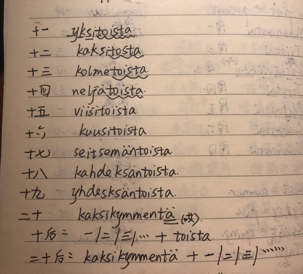 When they finished sauna,we chatted at the cafe.Jenny continued teaching us the number from 11 to 30 and I found some regulars in these numbers : there is the word”toista” behind the numbers from 11 to 19 and there also have the word “kaksikymmenta” in front of the numbers from 21 to 29. And we also learned the name of family numbers from each other.The tone of Chinese Pinyin maybe a little difficult for Jenny to pronounce and they were also difficult for me when I was a small child.Besides,a letter in Chinese has four different pronunciations and every pronunciation represents four different meaning.