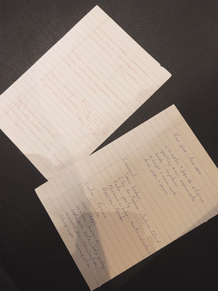 While thinking about what to tell about Finnish traditions we thought that it’s kinda hard since everyone has their own traditions. For example, we really don’t have traditions for Easter. But we managed to come up with some common ones to tell Renata about. It was interesting to hear about these holidays in Portugal. For example the foods they eat at Christmas – can’t even imagine some of them. We also went through some vocabulary about these holidays, like how to wish “Merry Christmas” in both Finnish and Portuguese.