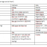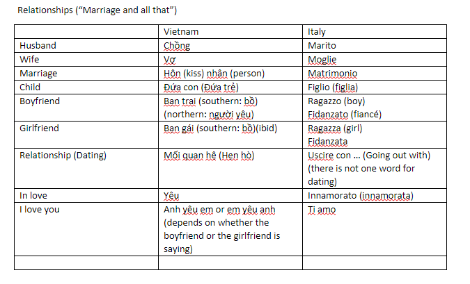 Basic vocabulary about this topic was given both in Vietnamese and Italian. While in Italian most of the people were open with the idea of early dating relationships, a part of Vietnamese adults are still quite not convenient about this. Furthermore, the way people talking and doing “sensitive things” in the public got the different approval rate between the two countries. Also our discussion had deeply gone through some common arguments between the ideas of cohabitation.
