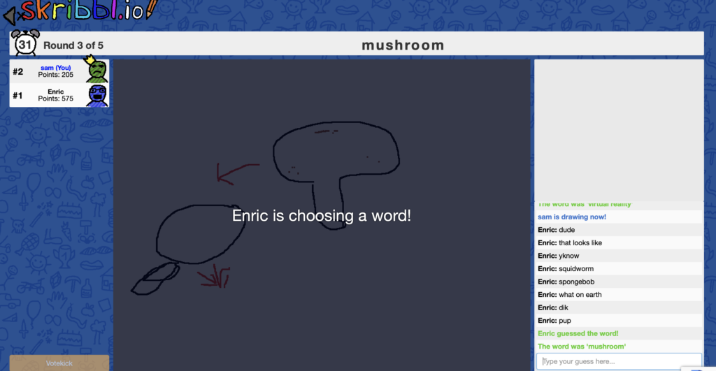 Today, we played skribbl.io, and every time a word popped up on the screen for us to draw, Enric would translate that word for me. For example, if the word is chicken then he would translate it for me as Pollo. Skribbl.io is a game that helps players not only practice their language skills but they can also choose a word and demonstrate their understanding in a unique way by drawing the word so that others can guess it.