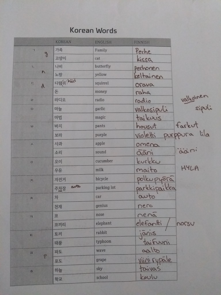 This time we started with Korean, because last time we started with Finnish. The first picture shows a list of Korean letters, and words starting with those letters. In my opinion the list is great for me to practice different sounds. For some reason the Korean vowels are easier for me to learn than reading the consonants, but practice makes perfect. 🙂