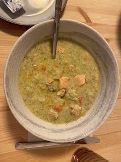 Today I went to the market hall in Tampere with Jasmin and Berk. We decided to try the salmon soup together. At first I was unsure if I would like it, but after testing it I thought it was surprisingly good. I never thought that putting fish in a soup would taste good, but it did! We looked up a recipe so that we maybe could re-cook it back at home for friends or family. Jasmin and Berk both also were surprised about how good it tasted. We talked about the historical importance of the marked hall and thought about how it might have looked like. We then walked trough the hall again looking for a dessert. Jasmin tried one of the Halloween-muffins, Berk bought one of his favourite: Cinamon-roll with berry jam, and I tried a Halloween-styled Berliner-styled doughnut. Note to self: If a candy in Finland is kind off a Gummy bear and black it most likely does not taste like coca cola but rather like liquorice… But all together we tried a pretty delicious lunch!