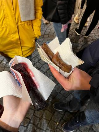 At the market, we tried several traditional foods. One special experience was tasting blood sausage, which is a typical food in Tampere. Although it was unusual for me, it was interesting to try something so closely connected to local culture. We also ate bear sausage with mustard, which was completely new for everyone and tasted actually very good. While walking through the market, we drank warm glögi and hot kakao, which helped create a cozy winter atmosphere.