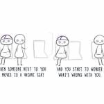- The bus was full when I jumped on so I had to sit next to random person. Oh how terrible it was! A few stops later beside us a whole set of seats was released. ”Oh yeah babe, oh yeah, I can move and sit alone for the rest of ride! But wait a second. Can I do it? Is it rude? But he want it also for sure. Oh anyway, I can`t do it. He is okey so I don`t want him get hurt.”