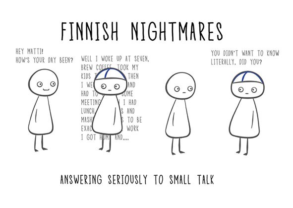 I travelled to USA in summer 2016 and went to the store. At the cashier seller said: ”Hello darling. How are you?” I just freezed in my place and stared to her. What kind of darling I am to you? Why you are interested in how is my day or life or anything? Finally I got stuck ”Hello, I am okey.” Yeah, right. Nothing like thank you, how about you or that kind of stuff. Well done Laura, well done. That would`ve been something like normal people call small talk.