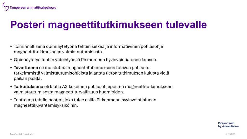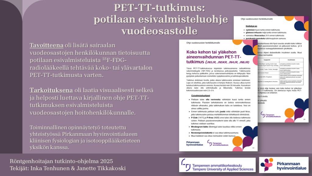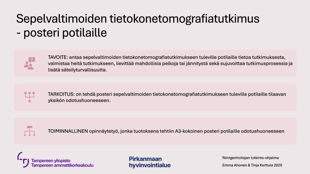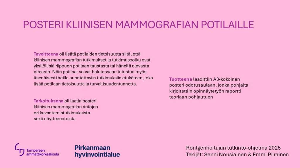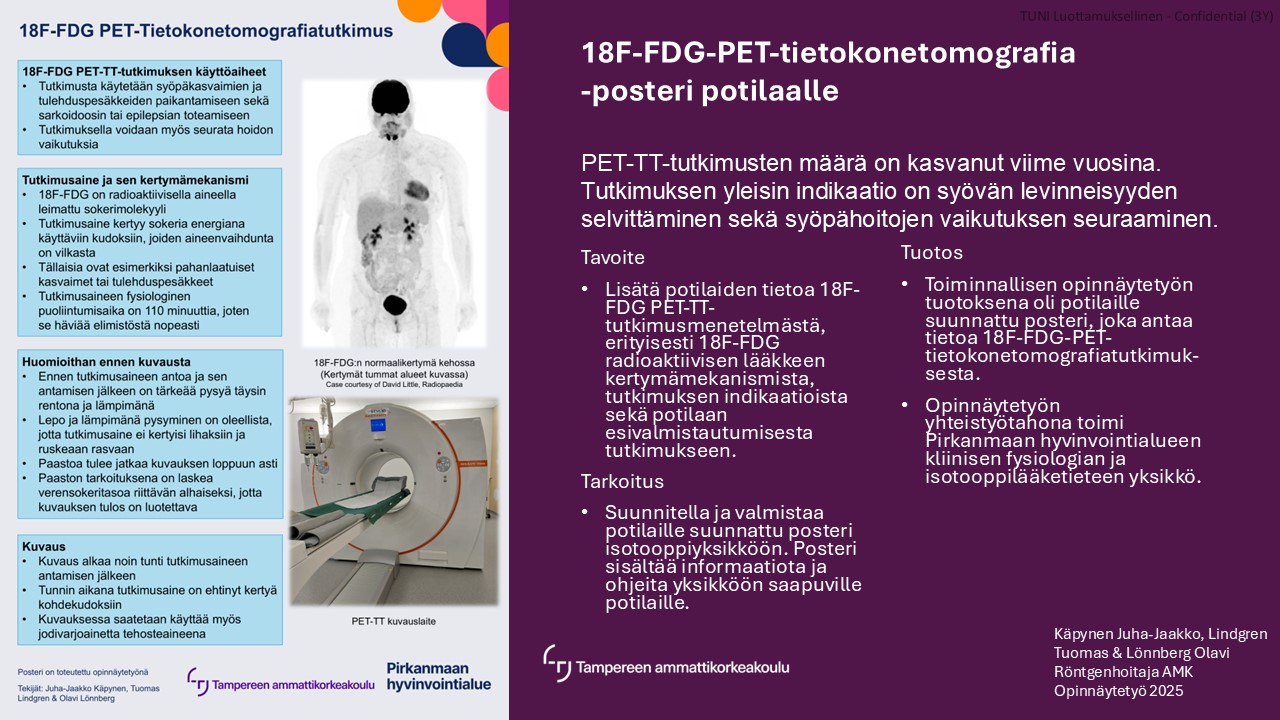 20.2.2024 Posterit 2023 Vuoden 2023 aikana TAMKin röntgenhoitajan tutkinto-ohjelmasta valmistuneiden opinnäytetöiden posterit. Opinnäytetyö