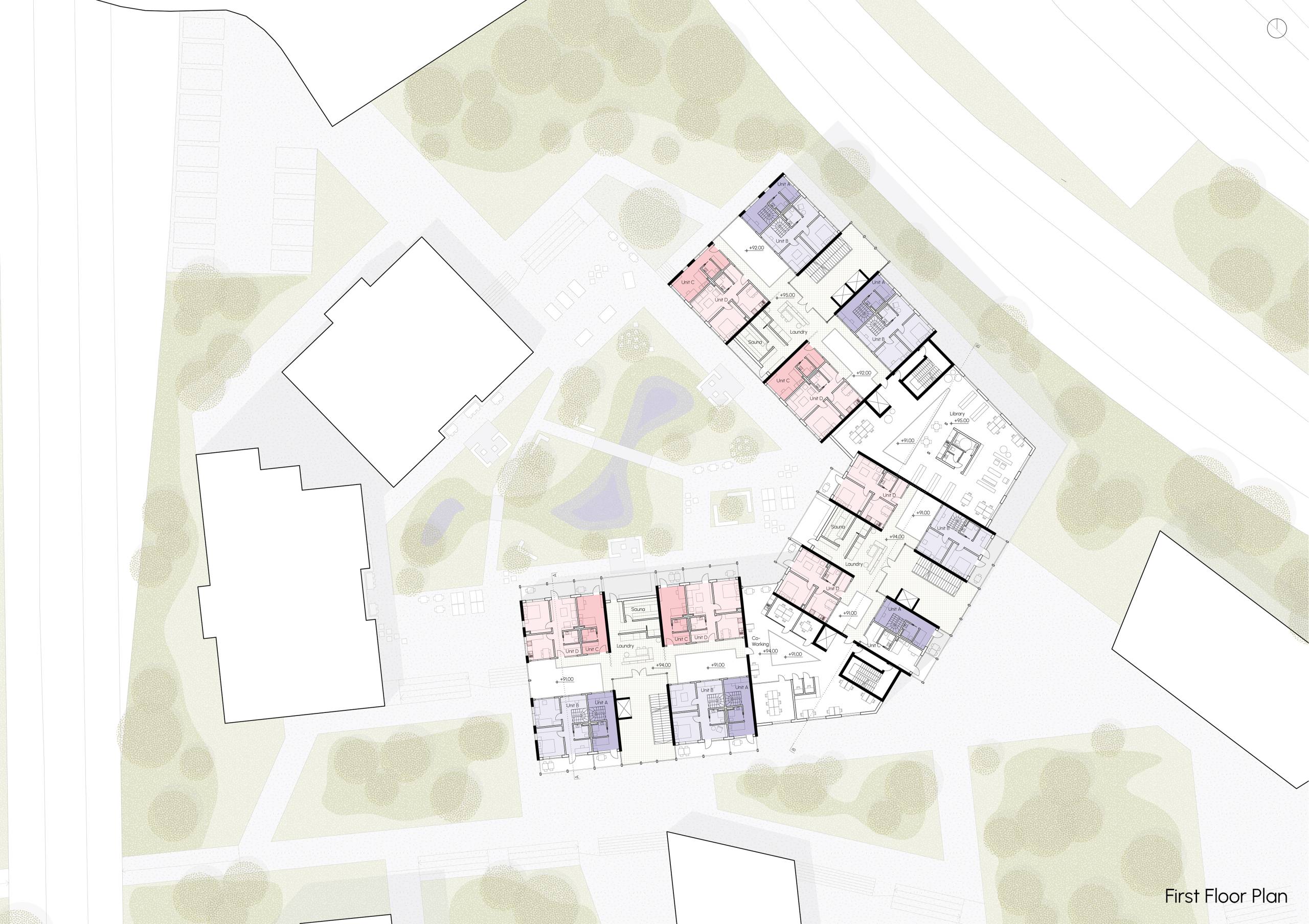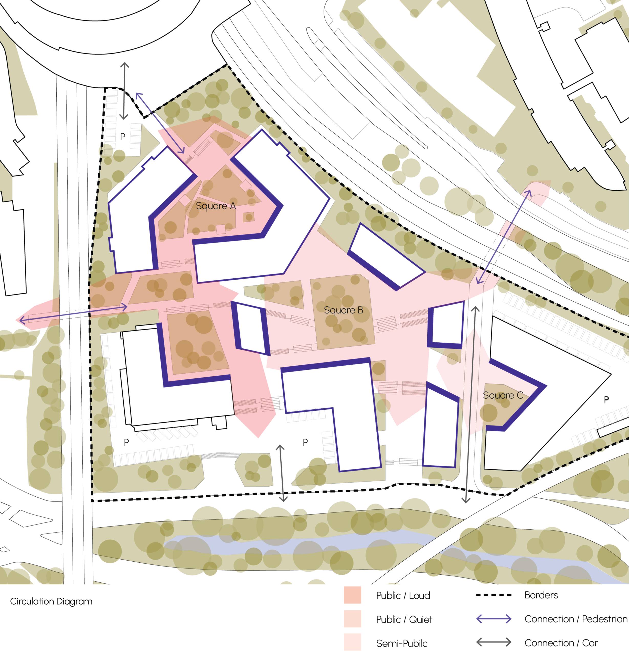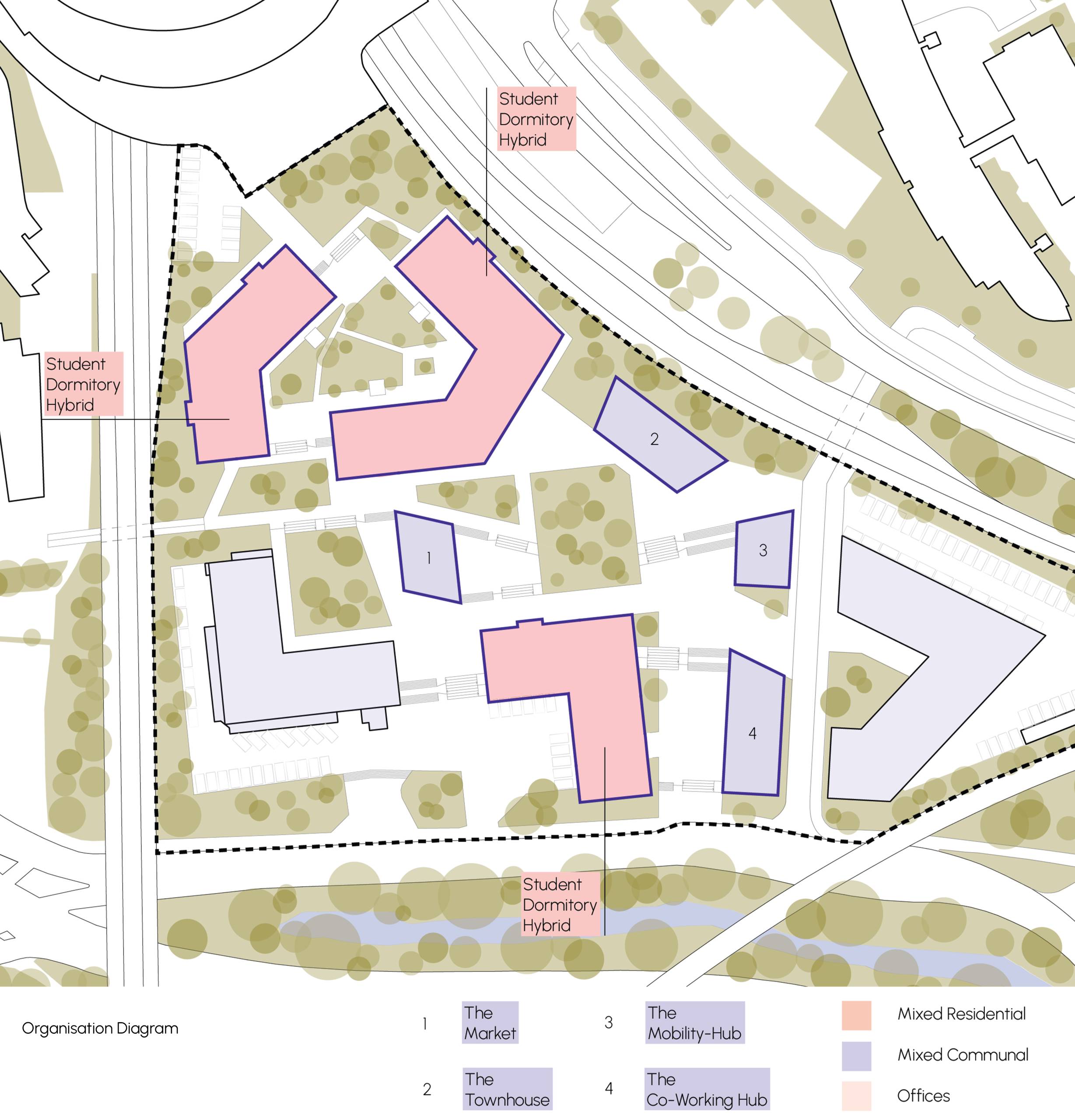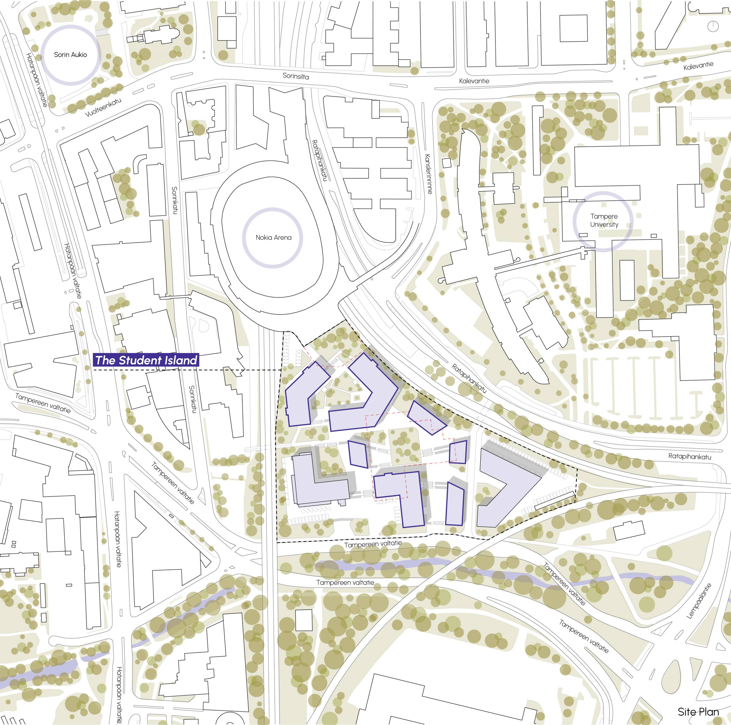 This project aims to transform an isolated site near the Nokia Arena into a vibrant, student-focused hub that reinforces Tampere’s identity as Finland’s second-largest university city. The area, bordered by major roads, presents a unique opportunity to create a “Student Island” that strengthens the connection between academic life and community. Our intention is to enhance the university’s character by fostering a international student community where Finnish and international students can live, learn, and collaborate. The design prioritizes a mix of student housing options, ranging from single units to shared apartments. With a focus on flexibility, the space will accommodate both short-term academic stays and long-term student life, ensuring adaptability to evolving needs. In addition to residential spaces, the site will feature communal areas, sports facilities, co-working spaces, and offices to promote interaction and innovation. Furthermore, the student island will support students’ daily needs with shops and leisure spaces. The project also seeks to integrate the site with its surroundings by connecting it to the Nokia Arena, the City Campus of Tampere University, and the broader Tampere city center, fostering a sense of openness and accessibility to create a sustainable, vibrant student community that enriches both the academic and social fabric of Tampere.