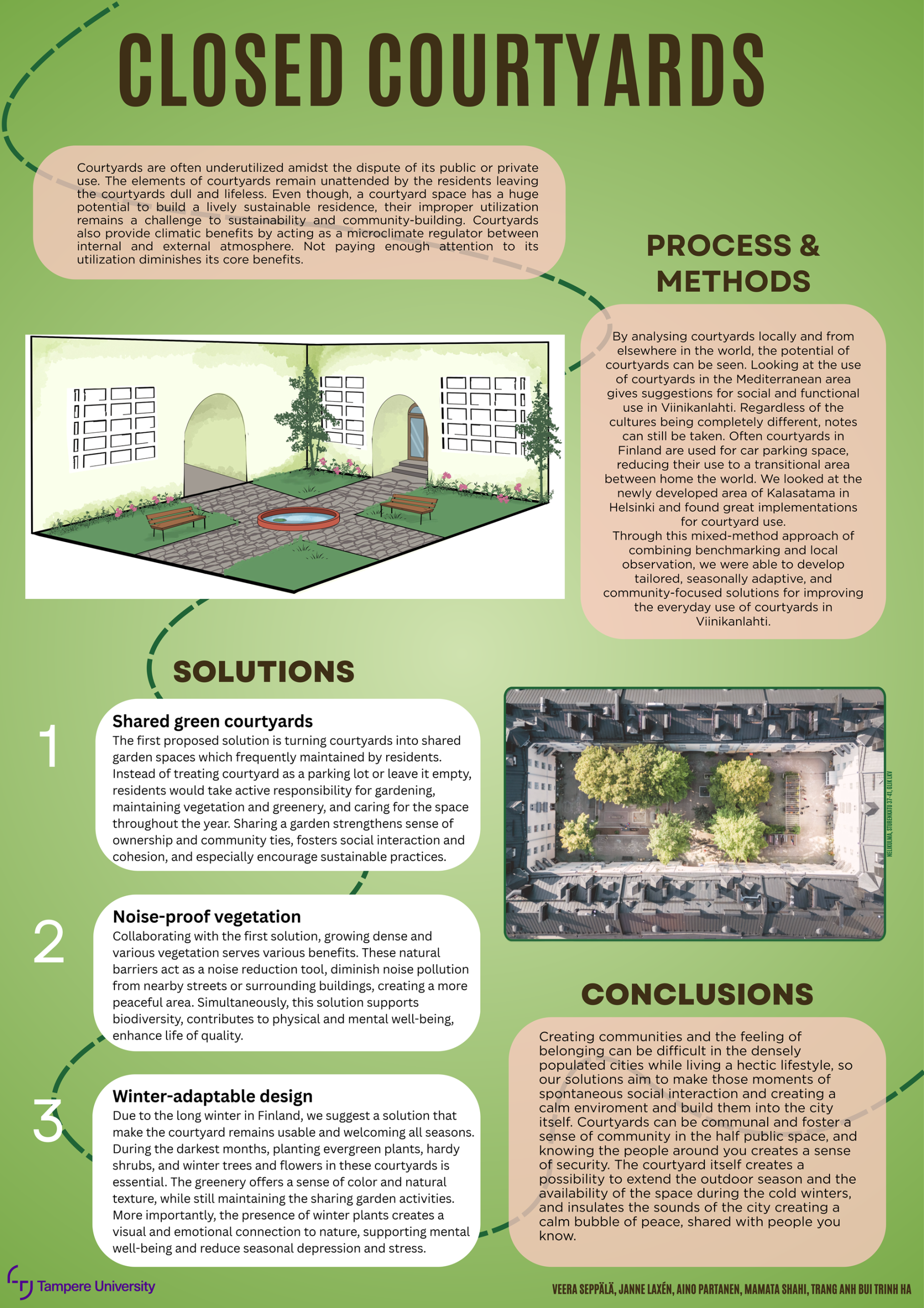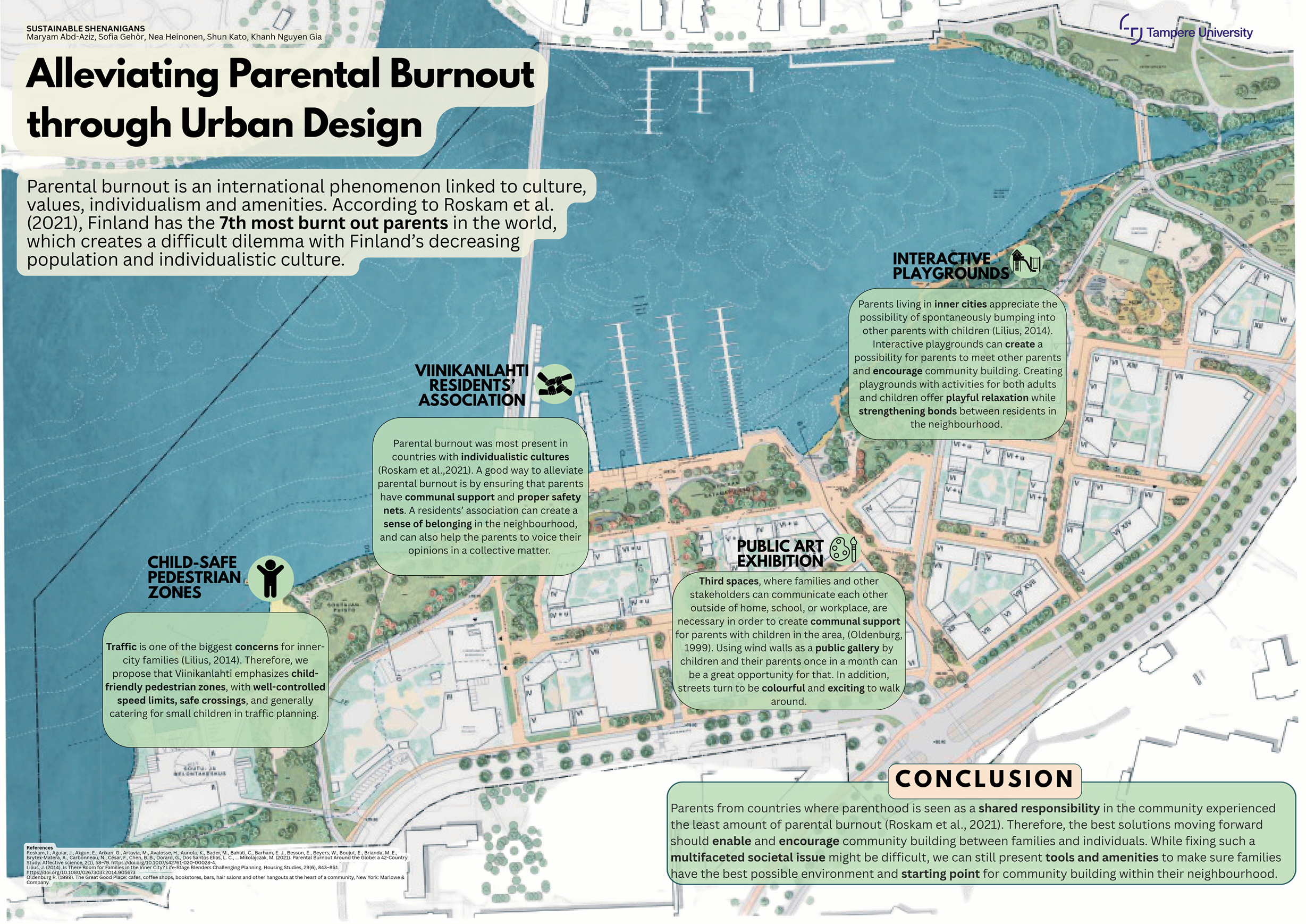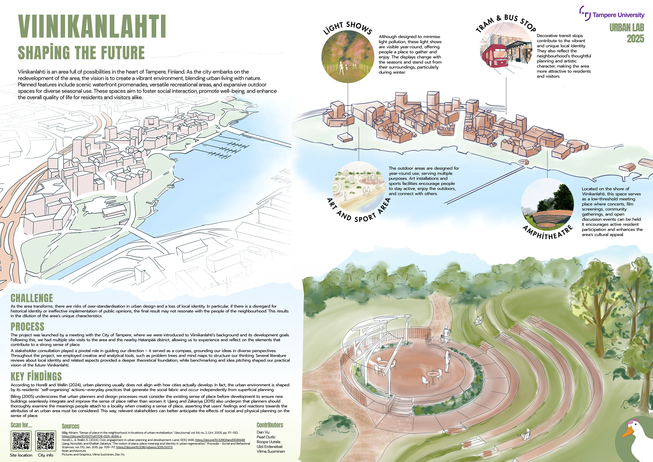 Throughout the course, the students cooperated with the stakeholders of the area: City of Tampere and the Viinikanlahti project, Tako rowers, Tampere Artists’ Association, Tampere Tram, Tampere Tunnetuksi ry (The Promoting Tampere Association), and Hakametsä Sport Campus.
