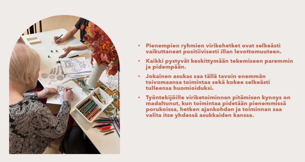 Asukkaiden yksilölliseen huomioimiseen on keskitytty Oma asukas –tunti kokeilussa, jossa omahoitajat ovat toteuttaneet omien asukkaidensa kanssa heidän toiveidensa mukaisia toiminnallisia tuokioita. Esimerkiksi asukkaan kanssa on käyty pyöräretkellä tai haravoitu lehtiä. Läheisyhteistyötä lähdettiin kehittämään asukaskohtaisilla viestivihoilla, joiden tavoitteena oli vahvistaa yhteydenpitoa. Jokaiselle asukkaalle hankittiin oma viestivihko, jonne hoitajat ja läheiset voivat kirjoittaa terveisiä asukkaan arjesta. Yhdessä hoivakodissa on suunnitteilla läheisille ja asukkaille yhteisiä tilaisuuksia esimerkiksi joulujuhla. Näitä tilaisuuksia suunnittelevat hoitajat, asukkaat ja läheiset yhdessä.