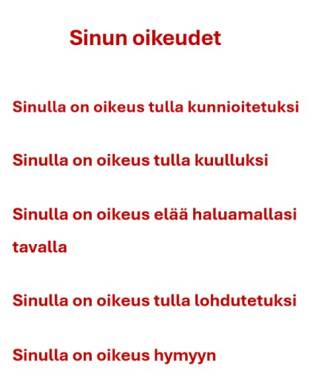 Geronomiopiskelijoina koemme tärkeäksi muistuttaa muistisairaita ikäihmisiä heidän oikeudestaan hyvään kohtaamiseen ja kohteluun. Tämän vuoksi kokosimme huoneentaulun, joka on kohdennettu hoivakotien asukkaille. Huoneentaulun hyvän kohtaamisen elementit toimivat muistutuksena myös hoivakotien työntekijöille. Huoneentaulu on laadittu muistisairaille ihmisille saavutettavaan muotoon ja sen teossa on käytetty tutkittua tietoa sekä työpajojen antia. Selkokielisyys, hyvin erottuvat värit ja kirjainfontin suuri koko tukevat huoneentaulun viestin ymmärtämistä.