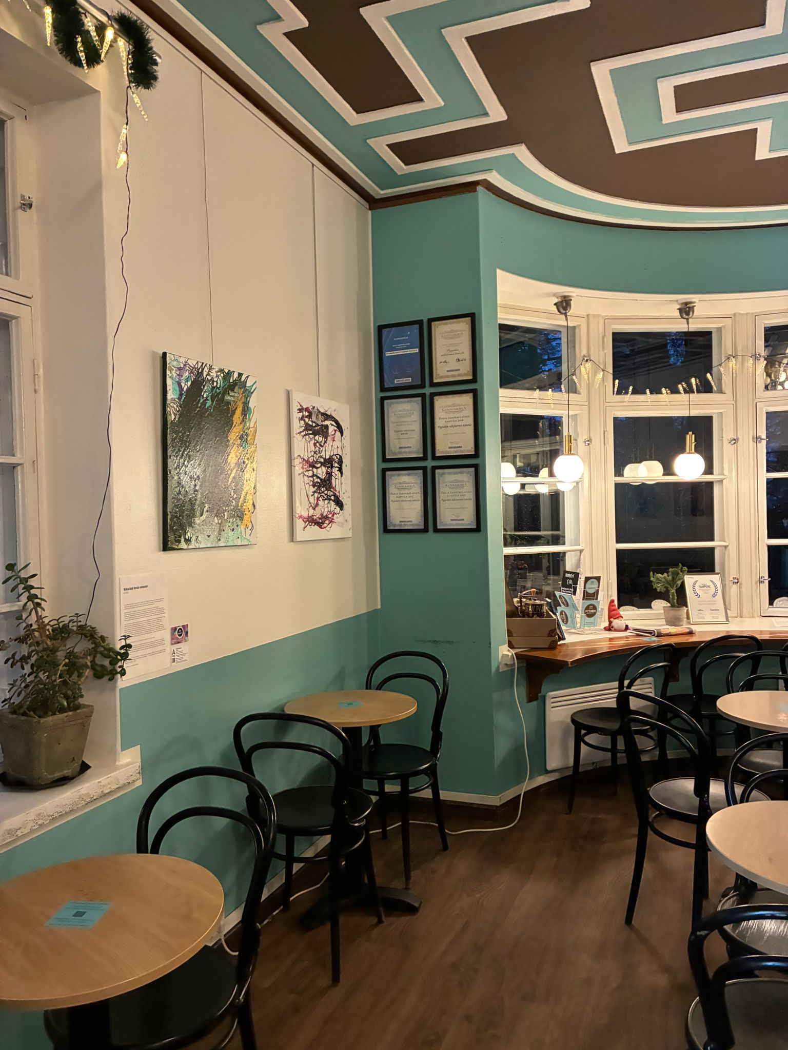 Hankkeen vielä pienen asiakaskunnan osallistumista helpotettiin jättämällä työpajan ohjeistus näkyville ennakkoon. Kävijät pystyivät osallistumaan leikkaamalla lehtileikkeitä etukäteen, jos eivät pääsisi työpajaan. Paja koostui akryylikaatotekniikan tekemisestä neljän asiakkaan kanssa ja lehtileikkeleiden liimaamisesta kuivuneisiin tauluihin. Pajan jälkeen toteutettu näyttely Pyynikin munkkikahvilassa mahdollisti osallistujille näkyväksi ja kuulluksi tulemisen omilla ehdoillaan. Julkinen näkyvyys antoi mahdollisuuden voimaantumiseen ja kokemukseen yhteiskunnallisesta osallisuudesta.